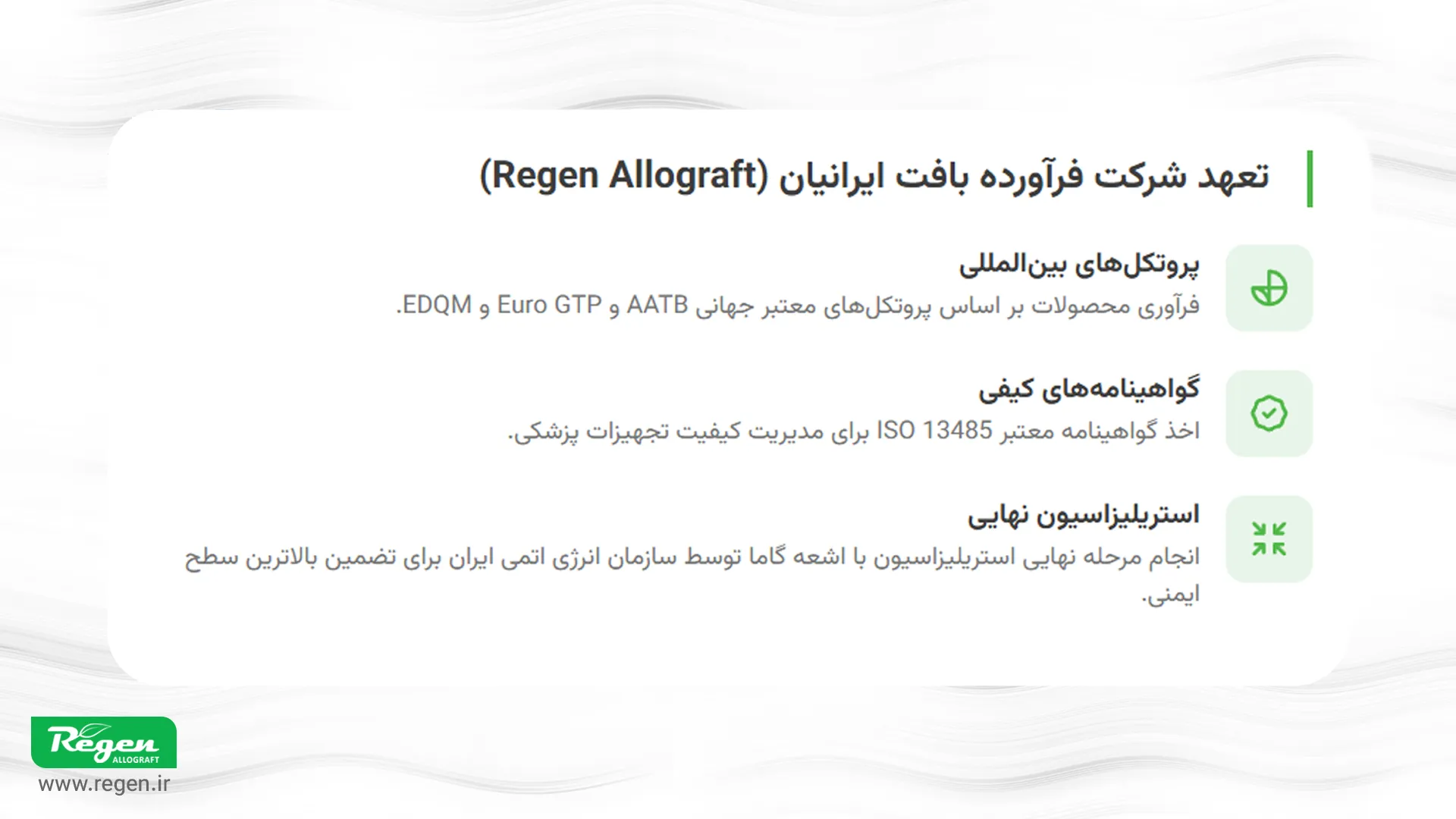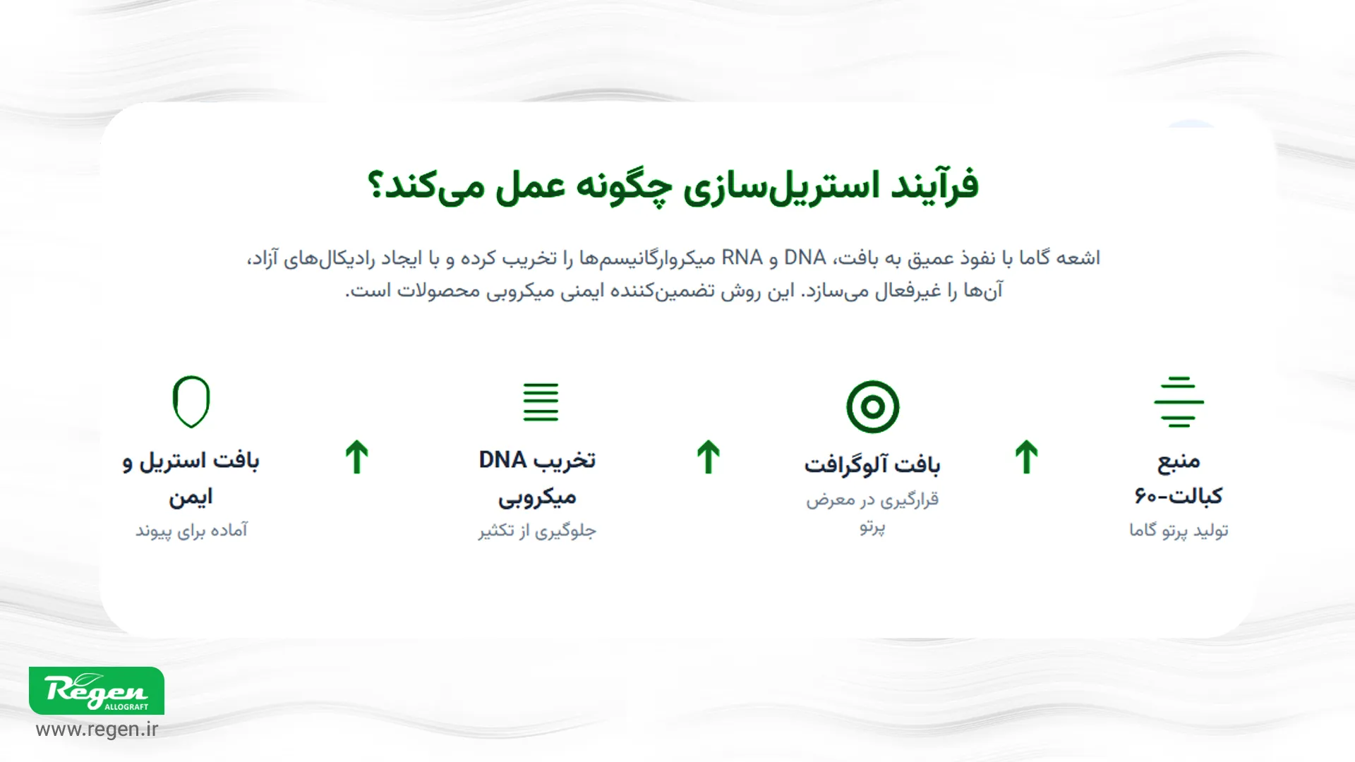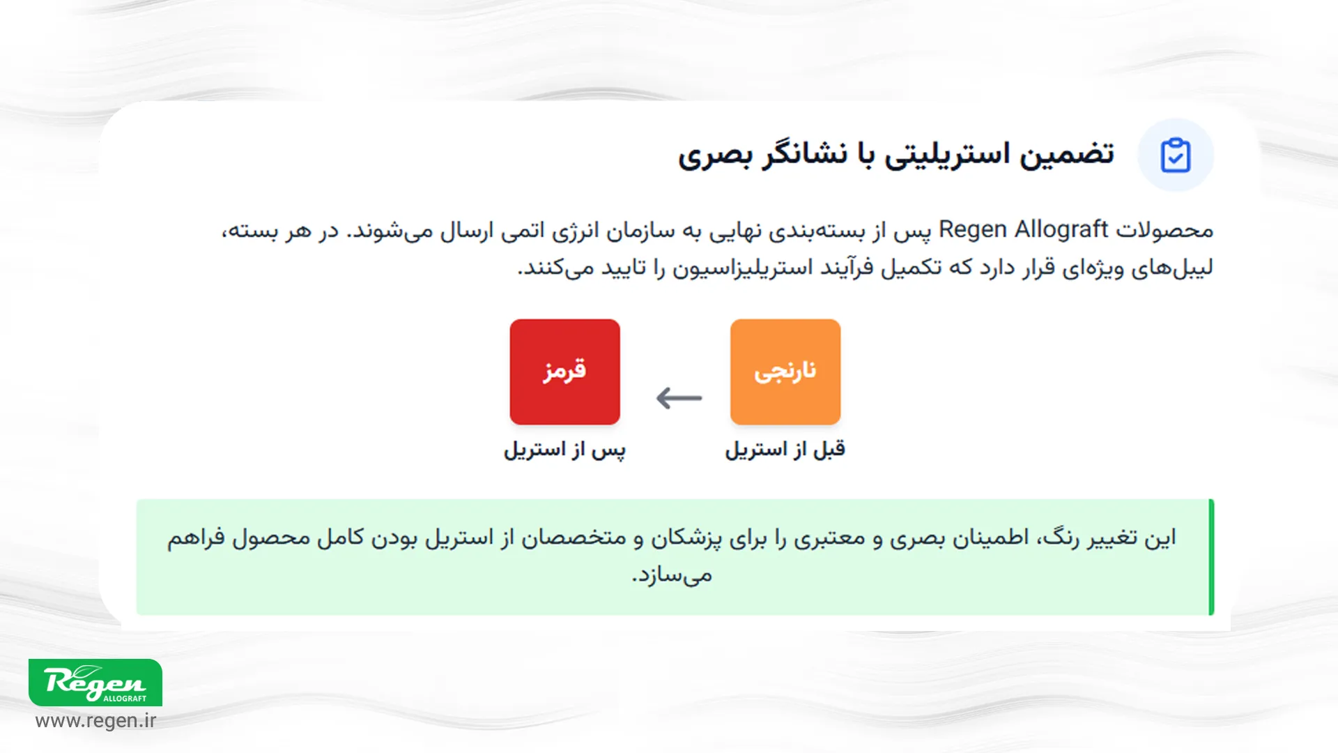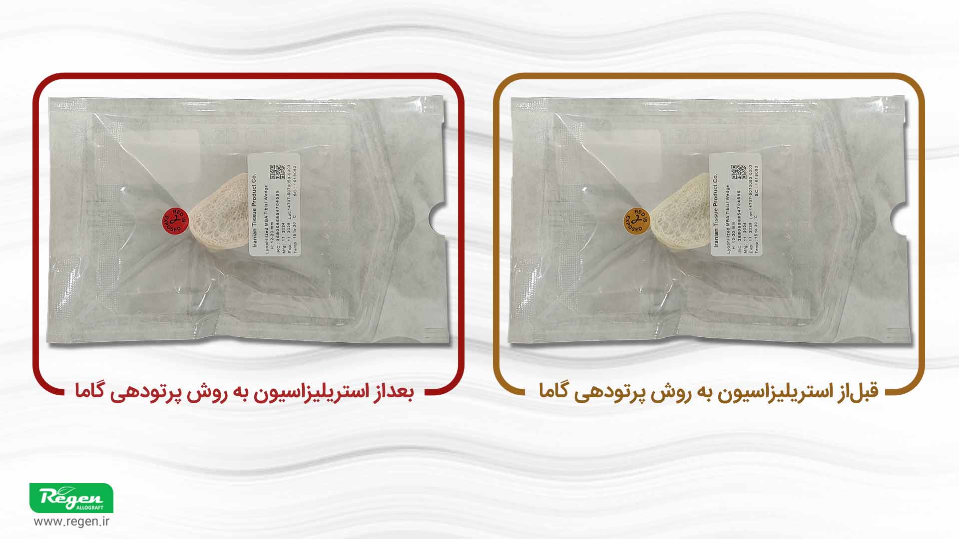 شرکت فرآورده بافت ایرانیان (Regen Allograft) تمامی محصولات لیوفلیزه خود را پس از بسته بندی نهایی به سازمان انرژی اتمی جهت پرتودهی گاما ارسال می نماید. در هر لایه از این بستهبندیها، لیبلهای ویژهای تعبیه شده است که پس از طی کامل سیکل استریلیزاسیون به روش پرتودهی گاما، رنگ آنها از نارنجی به قرمز تغییر میکند. این ویژگی بهعنوان یک نشانگر بصری معتبر، اطمینان پزشکان و متخصصان را از استریل بودن کامل محصولات فراهم میسازد. این تعهد به کیفیت، اثربخشی و ایمنی باعث می شود که این محصولات به عنوان محصولی قابل اعتماد برای متخصصین ارتوپدی، دندانپزشکی، جراحی فک و صورت و دیگر متخصصی مصرف کننده این محصولات مطرح شوند.