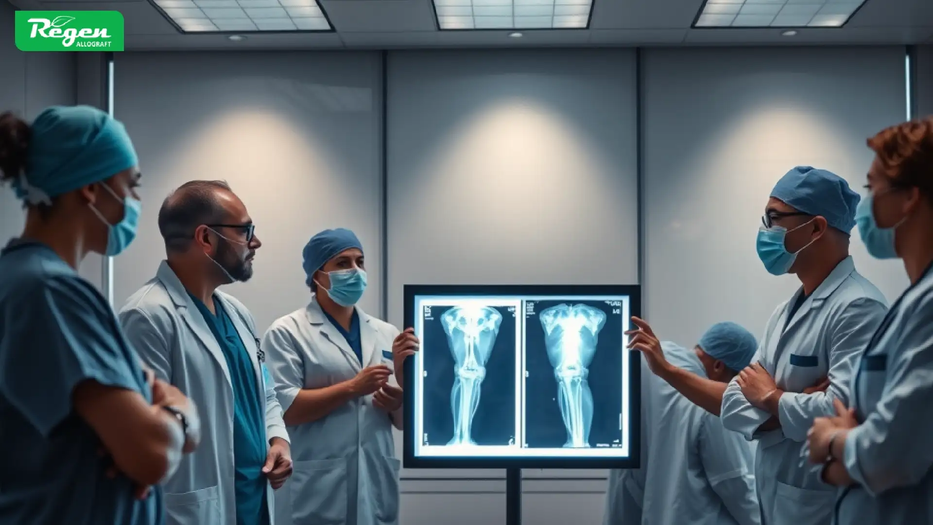 اساتید ارتوپدی در حال آموزش تکنیکهای استفاده از آلوگرافت در جراحی تعویض مفصل زانو (آرتروپلاستی زانو) به جراحان جوان در یک جلسه مشاوره تخصصی (ساخته شده با هوش مصنوعی)